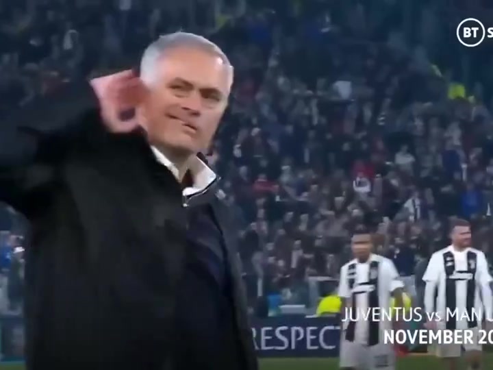 A montage of football coach Jose Mourinho performing various iconic gestures during matches, including shushing the crowd, gesturing to listen to the fans, and walking off the pitch.